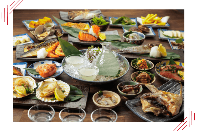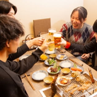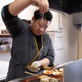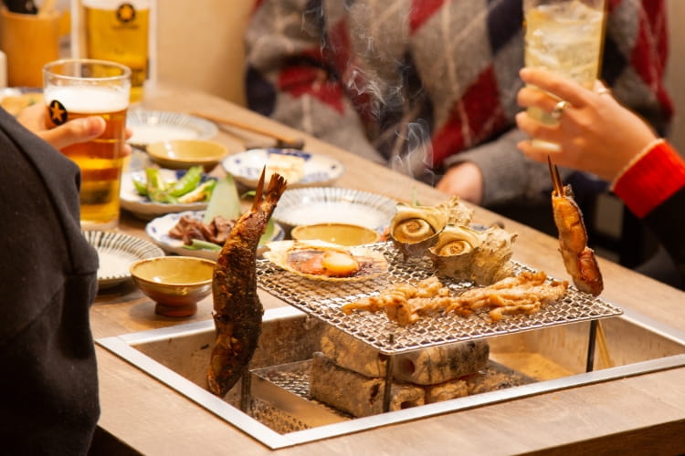 炉端焼きは、炭火でじっくり焼き上げ、表面は香ばしく旨みを閉じ込める日本の伝統的な調理法。青森産ホタテや銚子産の大トロいわしなど、産地直送の旬の食材をご堪能いただけます。焼き方がわからない場合もスタッフが丁寧にご案内するため、初めての方や海外からのお客様も安心です。