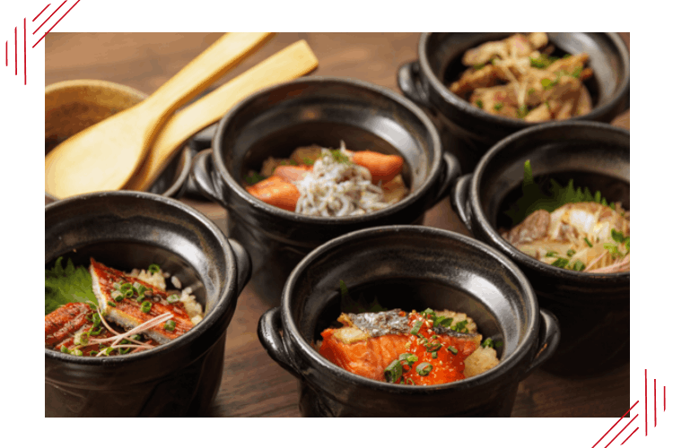 炊き立ての土鍋ご飯は、火璃のもうひとつの主役。土鍋で丁寧に炊き上げることで、米一粒一粒がふっくらと立ち、噛むほどに甘みと香りが広がります。「鮭といくらの土鍋ご飯」や「うなぎと山椒の土鍋ご飯」など、素材の旨みを存分に味わえる贅沢な一釜を数種類ご用意。炊きたての美味しさを味わい尽くしてください。