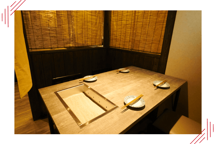 木の温もりあふれる、ゆっくりと落ち着ける空間。店内は全52席をご用意し、テーブル席を中心にゆったりとお過ごしいただけます。カウンター席以外には焼き台を完備しており、目の前で炉端焼きを楽しめるのも魅力です。また、カーテンで仕切られた半個室もご用意しております。
